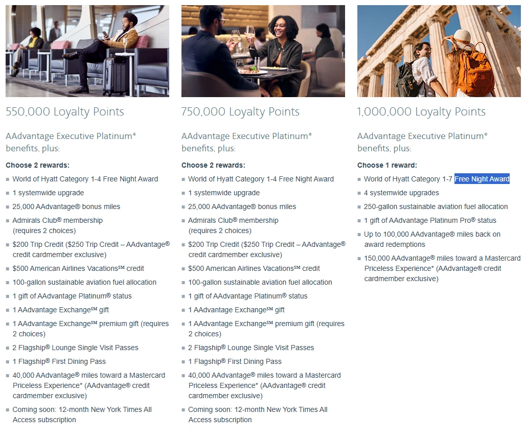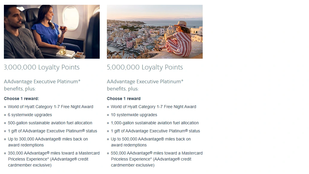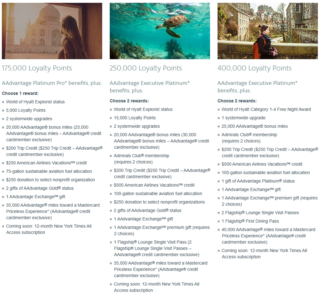 For certain loyalty thresholds, earn additional rewards. Unlike other airlines, AA milestone rewards also impact