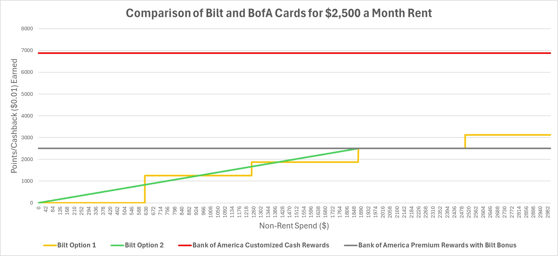 I have compiled a graph to illustrate where the cards intersect to earn points on rent, given a $2,500 per month rent cost. Since there is a 3% fee and not everyone value Atmos miles equally, I omitted the Atmos credit cards for this example. Each condition below is in the ordered by which to consider first: